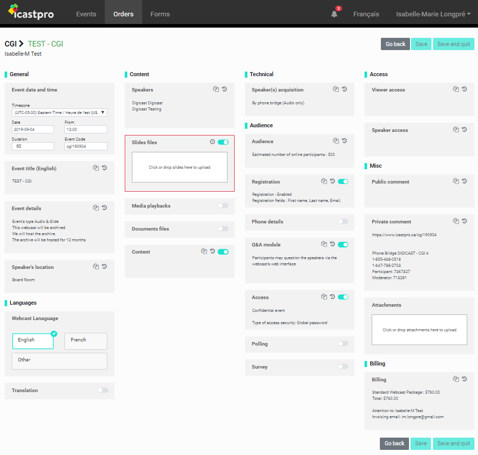 As the webcast approaches, you will receive notifications by email for items to submit: presentation, speakers names and titles, etc. If you have selected other content to be played during the webcast (audio or video), you will also need to submit here. You can find all your notifications at the top right of the screen.