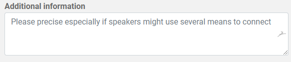 Let us know as much information as you can about how your speakers will connect: will they be all sitting in a room or will some or all connect via phone from different locations?
